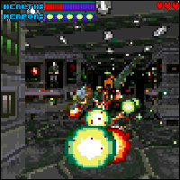 There are many different levels. Over 20 (I’ve not managed to complete all of them yet, but that is a goal I have for the next months.) to be exact. These differ in environment and difficulty. You’ll notice that the textures are nicely drawn. Each level contains a secret room with bonuses. Very handy when you feel that luck is running out. I also found a mini-game inside Gloom. It is a fun version of the classic Defender from the arcades. Great stuff. There should be other mini-games available after what I’ve heard. Can you find them all?