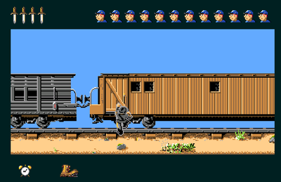 Last, but not least, there’s the train robberies. In typical Wild West style, one of your soldiers boards a train filled with huge sacks of money. If you succeed in reaching the driver of the locomotive in time (notice the counter on the bottom of the screenshot), you’ll get all the cash! This will in turn be used to supply you with additional armies. Like forts, the train robberies are all about platform gaming skills. Do you have what it takes?