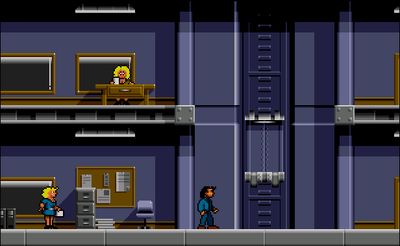 It all begins in an office building that (probably) belongs to the L.A Police Department. You are in control of Martin Riggs and you have the option to select either mission 1, 2 or 3. Mission 4 is locked. You can also enter the computer room to check mission status reports and enter level codes. If you don’t feel like playing as Martin Riggs, you can head over to the locker room, and you’ll be able to play as Roger Murtaugh instead.