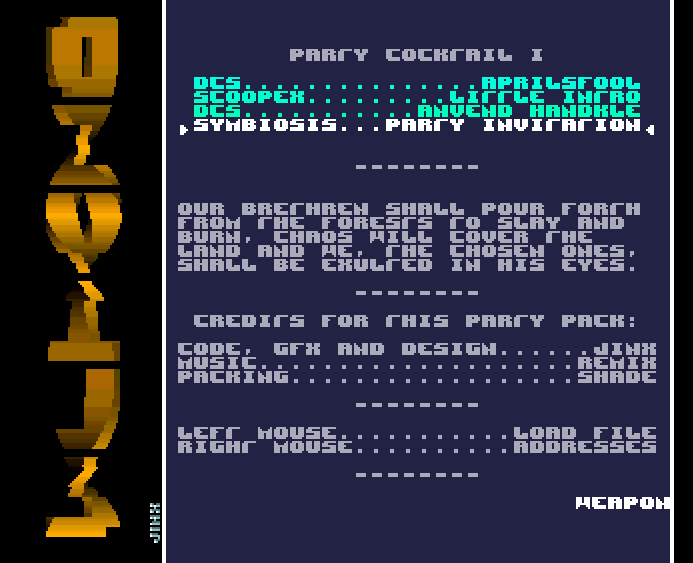 On the other hand you had the straight-to-the-point packs with no fuzz. These could contain scrolling text on the screen and a menu of intros you could run. A good example here is Hitpack by Gods or Party Cocktail by Devils.