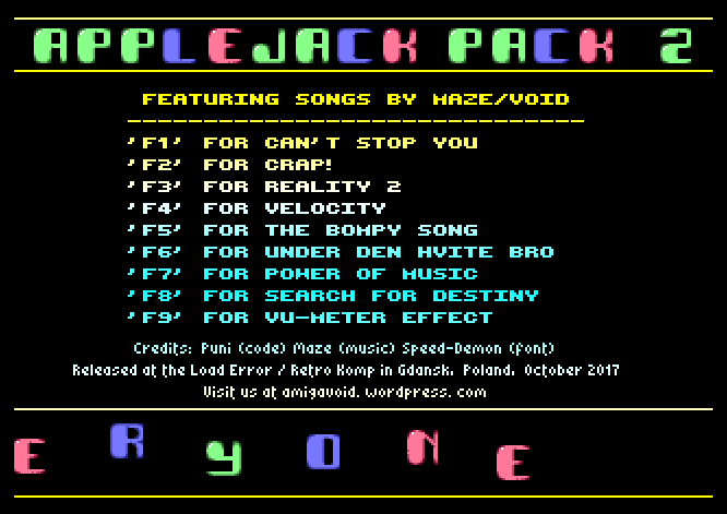 We in Void released two Amiga productions last weekend at the RetroKomp / Load Error demo-party in Poland! One intro called “7 Ate 9” and one music-pack called “Applejack Pack 2”. You can find more information about these over on Pouet.net: