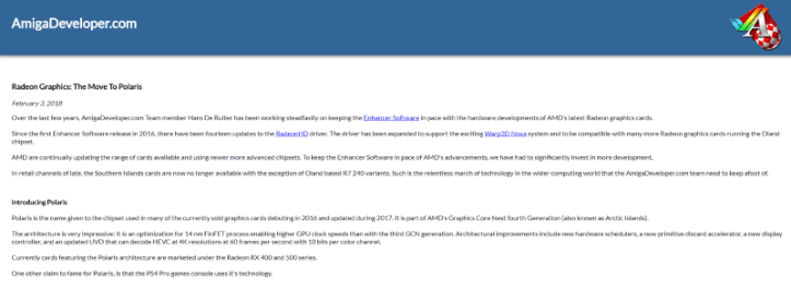 AmigaDeveloper.com has published a new article called Radeon: The Move To Polaris. This text gives you an insight into the development of the graphics drivers in the forthcoming Enhancer Software V2 relase. Please follow the link below.
