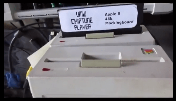 Watch an Apple II play 30+ minutes of chiptune music from one 140k disk using only a 1MHz 6502, 48k of RAM, and a Mockingboard sound card. I apologize for the audio quality, something’s a bit off with my capture setup. Code, disk image, and more info can be found here: