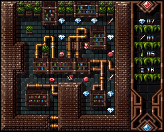 Assume the role of a fearless boy and collect the required number of diamonds in each stage in order to win the girl’s heart! Travel from maze to maze, kill the baddies, avoid the traps, collect beers (your necessary “fuel” to keep you going), find the diamonds, prove to her you’re WORTHY!!