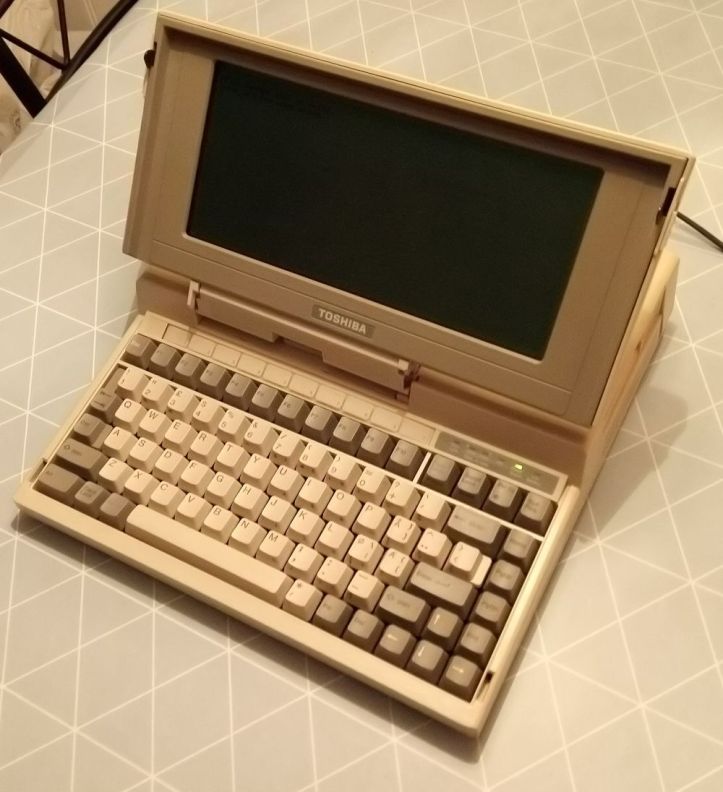 It is a Toshiba T1200 from 1987 and it is definitely the oldest laptop I’ve ever put my hands on. I tried connecting an external PSU/charger and it booted to the “Insert system disk” screen right away.
