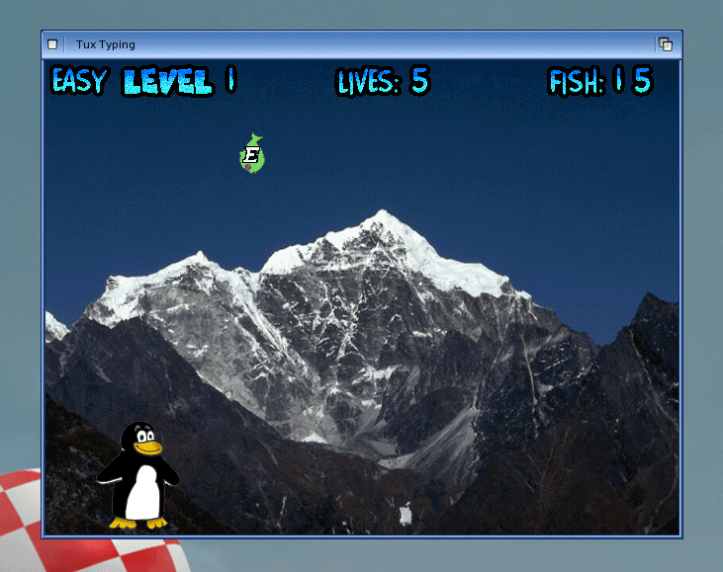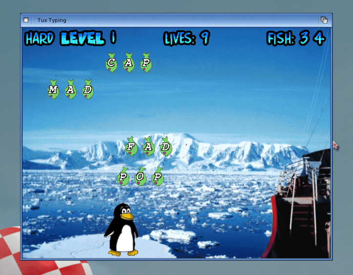 The object of Key Cascade is to guide Tux, the Linux Penguin, to eat a certain number of fish. When you’ve eaten enough fish, you advance to the next level. To catch a fish, you must type the correct letter it has. - Word Cascade