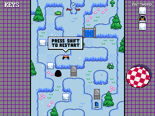 Controls are straight forward. Cursor keys are used to move the hero around, “Shift” to restart and “Escape” to quit the game. To move blocks, push the appropriate cursor key in the direction you want to move them.