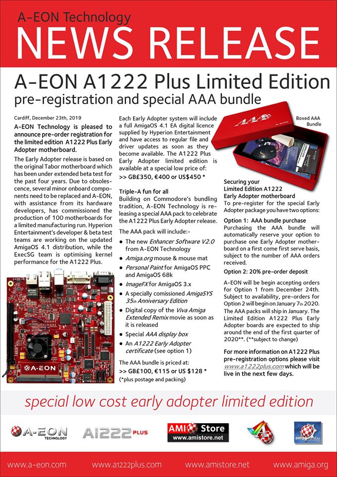 Each Early Adopter system will include a full AmigaOS 4.1 EA digital licence supplied by Hyperion Entertainment and have access to regular file and driver updates as soon as they become available. The A1222 Plus Early Adopter limited edition is available at a special low price of: GB£ 350, €400 or US$ 450*.