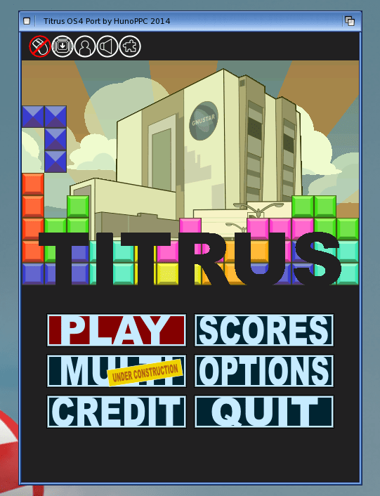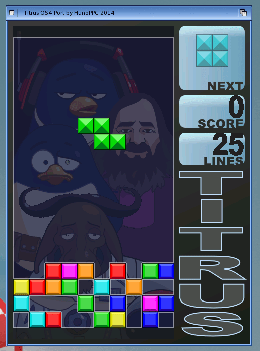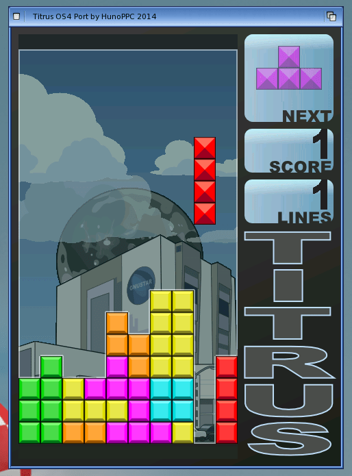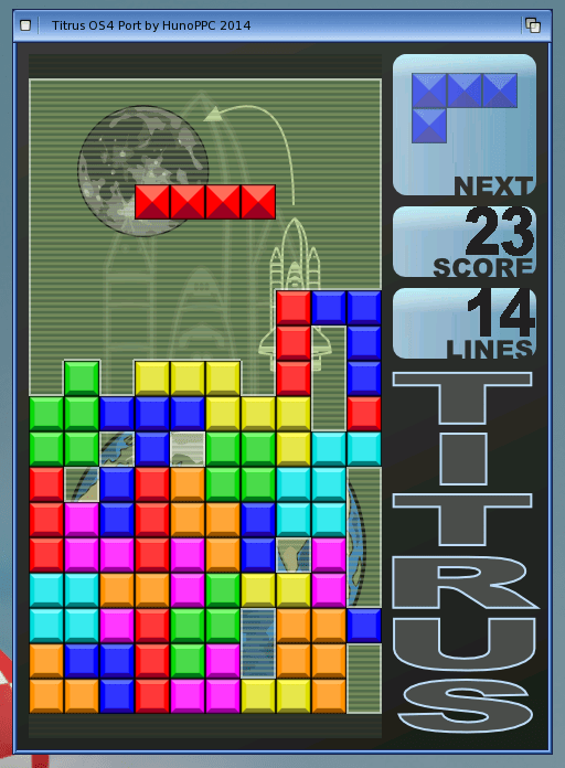 Since it’s been a while since I wrote a game review for this platform, I thought I’d jump right in and check out a puzzle game called Titrus. This one was developed by Splashouille and ported to AmigaOS 4 by HunoPPC in 2015. As the name of the game implies, it is very similar to Tetris. 😉