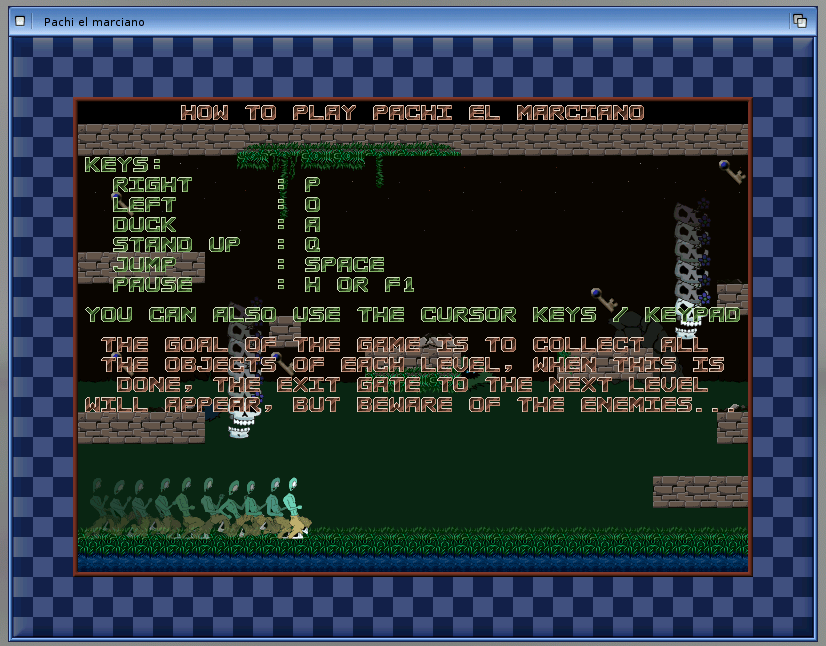 The controls are easy to get used to. Space to jump, cursor keys to move to either side, duck or rise up. The aim of the game is straight forward. Collect all the objects on each level and then advance to the next. π