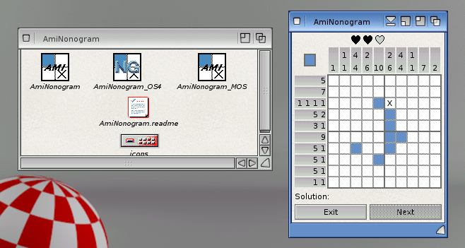 Alper Sönmez released version 1.0 of the open source Workbench Nonogram game called AmiNonogram. According to the author, Nonograms, also known as Hanjie and Picross, are logic picture puzzles in which cells in a grid must be colored or left blank according to numbers at the side of the grid to reveal a hidden picture. The game can be obtained from OS4Depot. If you are interested in creating or editing packs for the game, the author released an editor on the 27th of May which lets you do this. Please check it out here.