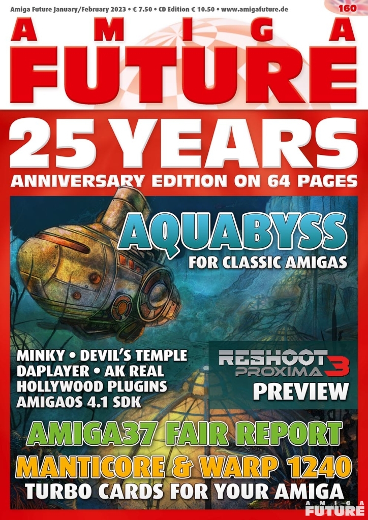 Issue 160 of Amiga Future for January and February 2023 has been released! In the magazine, you can read about DAPlayer, Hollywood Plugins, AmigaOS 4.1 SDK, a report from Amiga 37, and much more. You can purchase this issue directly from the publisher here, or an Amiga store.