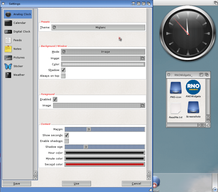 RNOWidgets is a collection of small and helpful utilities that is placed on your desktop. Here you’ll find a calendar (ISO), an analog clock, a digital clock, notes, pictures (local and net), RSS/Atom feeds, stickers, and weather.