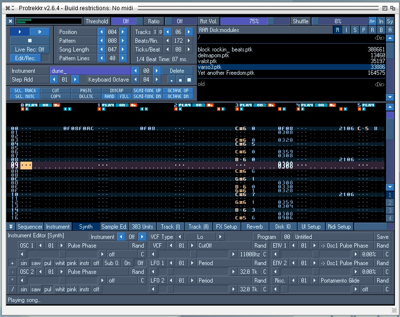 ProTrekkr is a tracker program combining a software synthesizer together with a traditional samples tracker which can (mainly) be used to create electronic music (like psytrance, trance goa, hard acid, IDM, chip, techno, jungle, etc.) targeting small sized intros, demos or games.