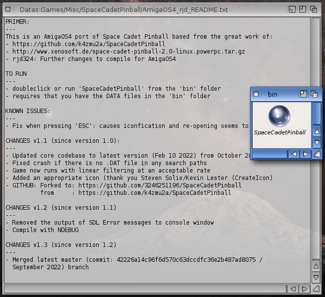 All in all, I’m happy that we have Space Cadet on AmigaOS 4. It is a fun pinball game and it runs beautifully on the Sam460LE. I like having it running in a window on the desktop. Looks great that way! 🙂 It is fun to play and I will be revisiting it from time to time in the future for my pinball fix.