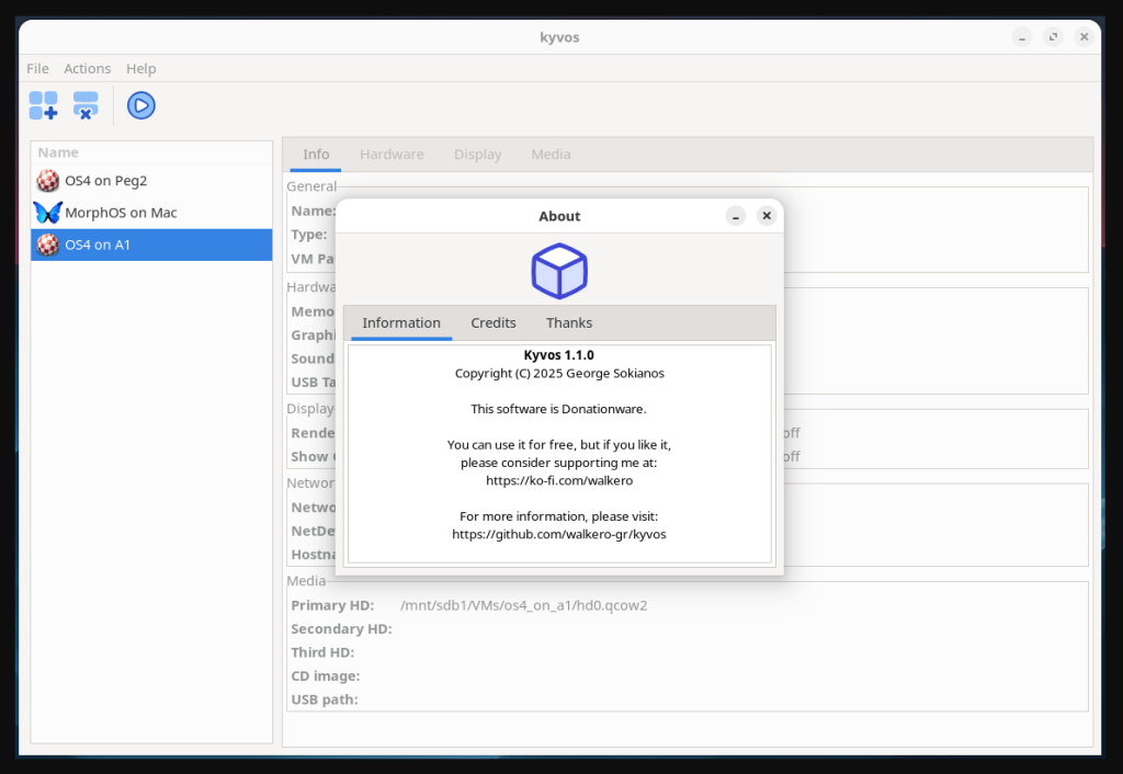 Kyvos is a user-friendly frontend for Qemu, designed to streamline the creation of AmigaOS 4 and MorphOS emulated environments on Linux, macOS, and Windows. Pronounced “kee-vos,” this name is inspired by the Greek word “κύβος,” meaning cube, symbolizing these virtual systems running within the host OS.